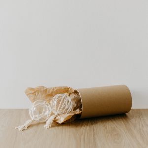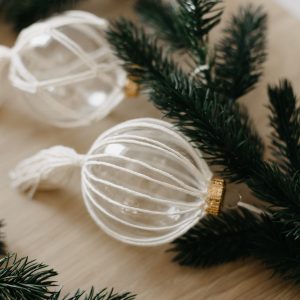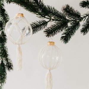 A klasszikus üveggömböket egyedi makramé dekoráció teszi otthonossá a fenyőfán.